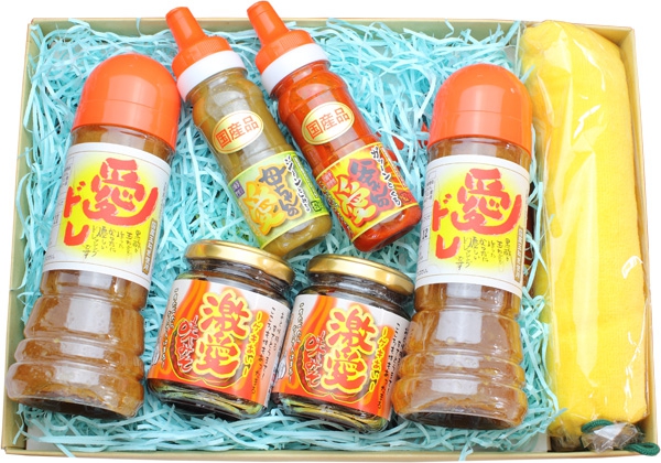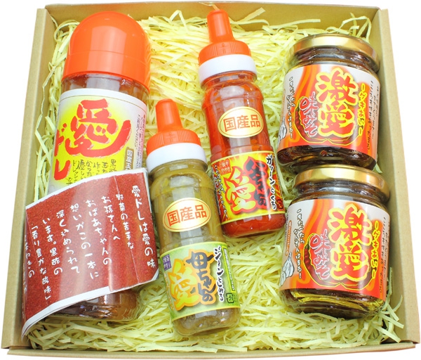 愛ドレ、激愛味みそ、柚子ごしょうの詰め合わせギフト商品です。
